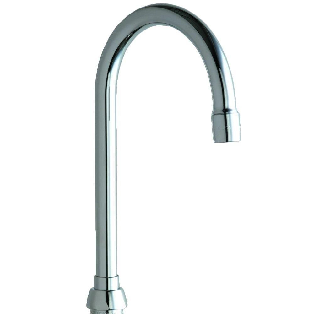Chicago replacement part GN2AE3JKABCP is a gooseneck spout compatible with most Chicago Faucets, featuring a 1 1/16 inch-18 UNEF male body outlet. This swing gooseneck spout is designed for commercial use.