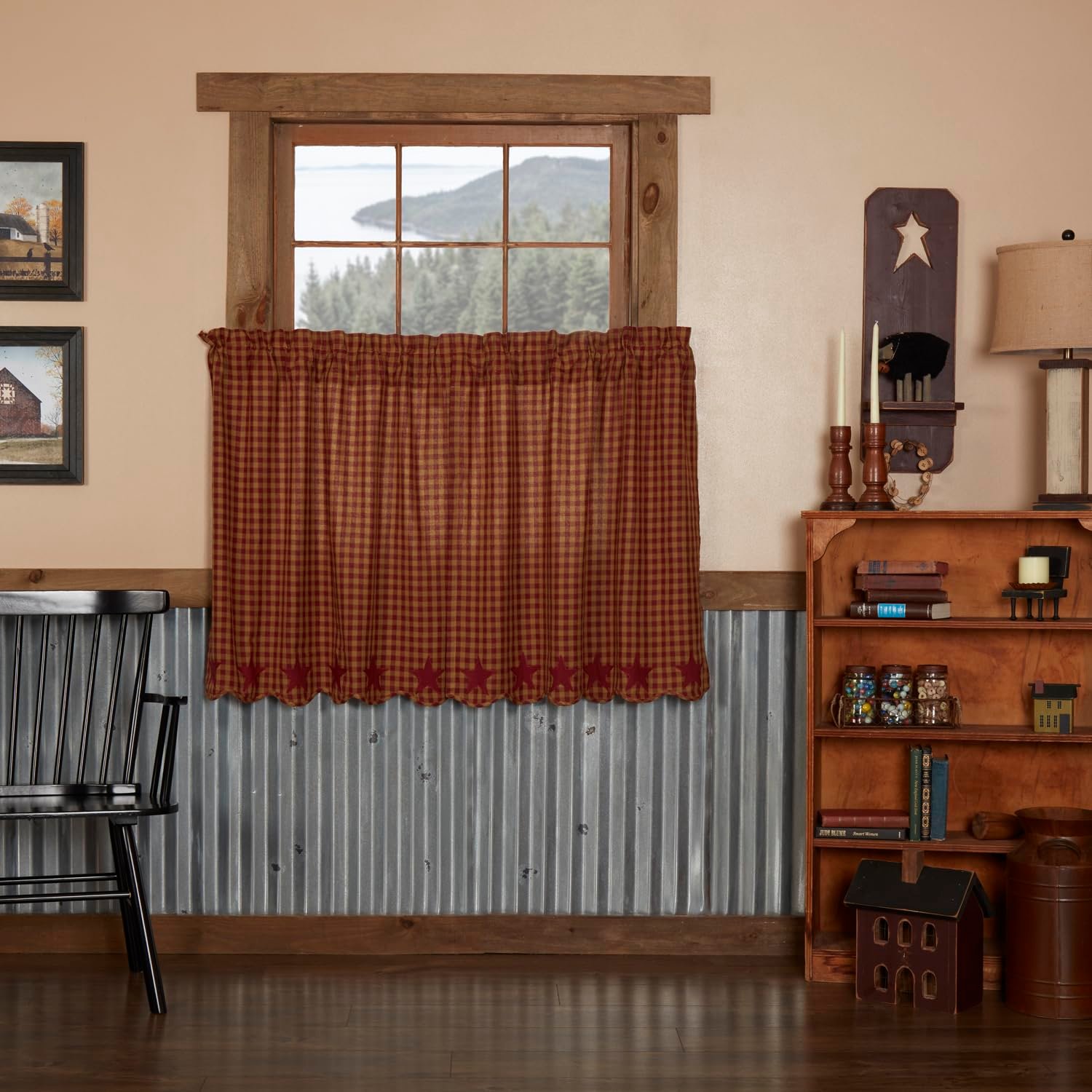 Burgundy and tan check base fabric with 5-point stars in solid burgundy. Lined with white cotton. Enhance your kitchen decor with these classic country primitive curtains.