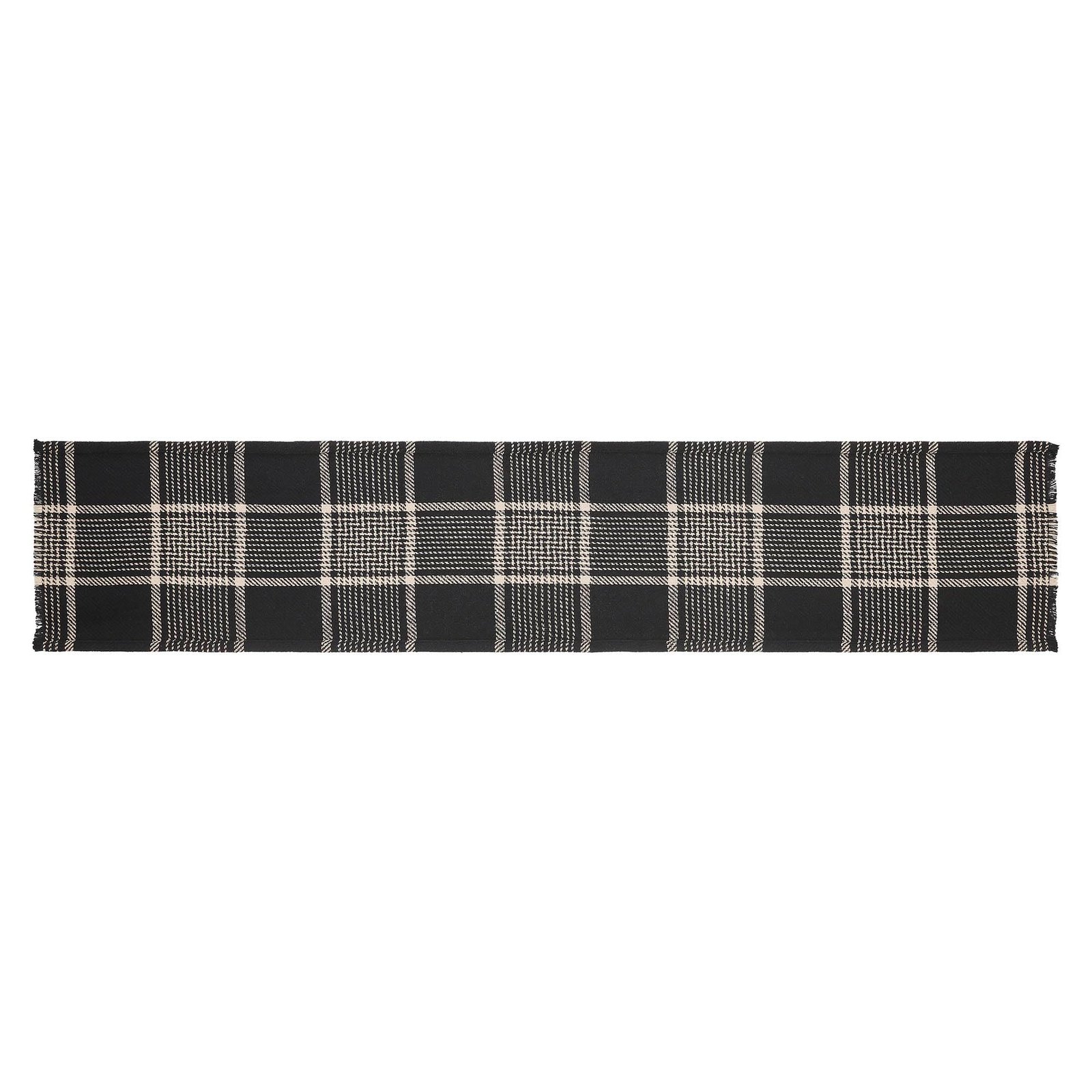 Upgrade your tabletop with the Eston Black Tan Runner measuring 12 by 60 inches. Constructed from recycled cotton, this table runner features deep tones of black and tan with frayed edging, perfect for a seasonal touch. Pair with other pieces from the Eston Black Tan Plaid Collection for a classic farmhouse look.