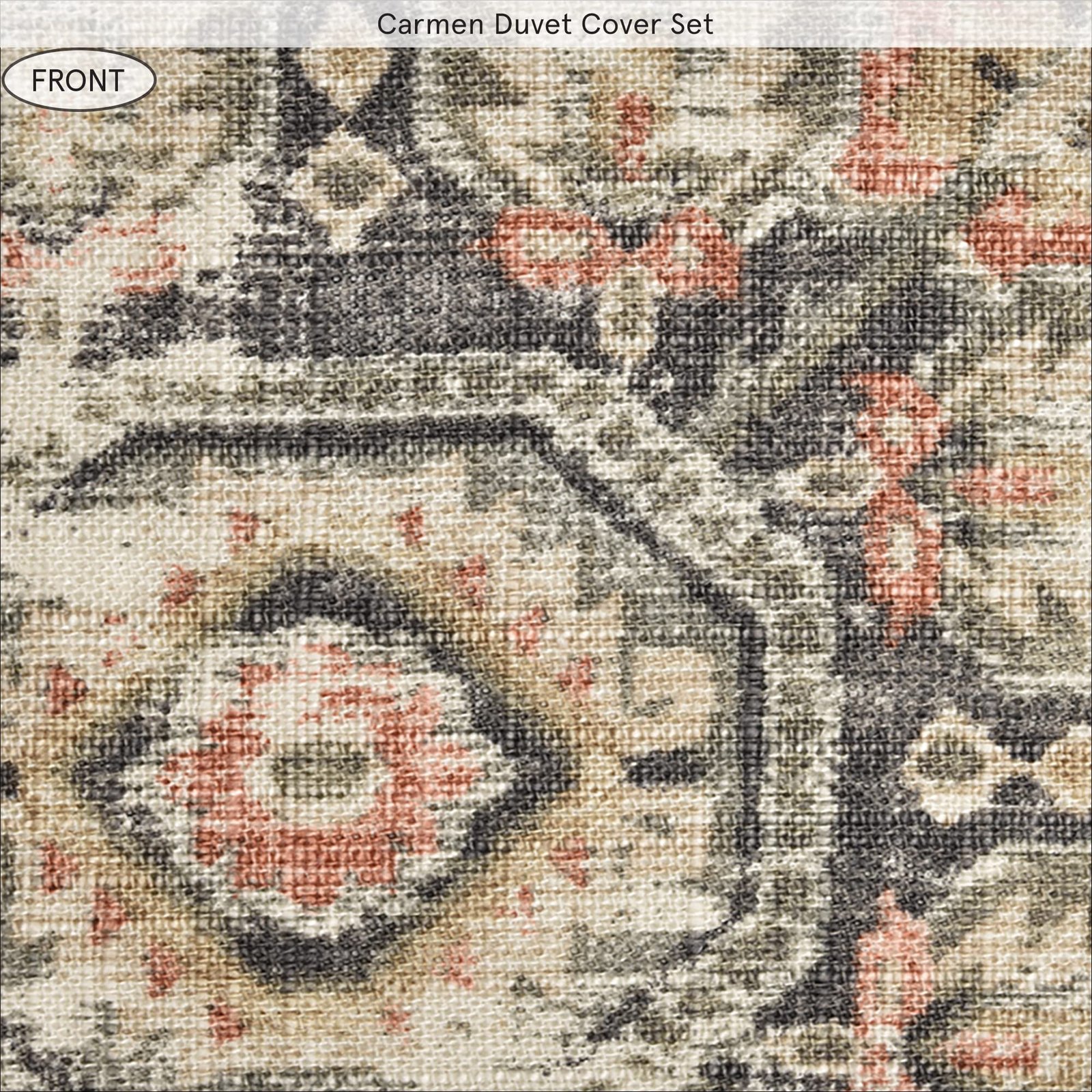 Explore the old-world charm of kilim through our sophisticated Carmen Collection. The vintage kilim print hosts soft shades of cream, sienna, and charcoal that inspire a romantic feel, while its linen blend construction brings softness, breathability, and ease-of-care. Bold yet elegant, Carmen feels at home in any traditional or modern rustic bedroom. Our Carmen collection features Comforter and Duvet Cover Sets, Euro Sham, and Decorative Throw Pillow in a kilim pattern, complemented by solid color Euro Sham and Bed Skirt.