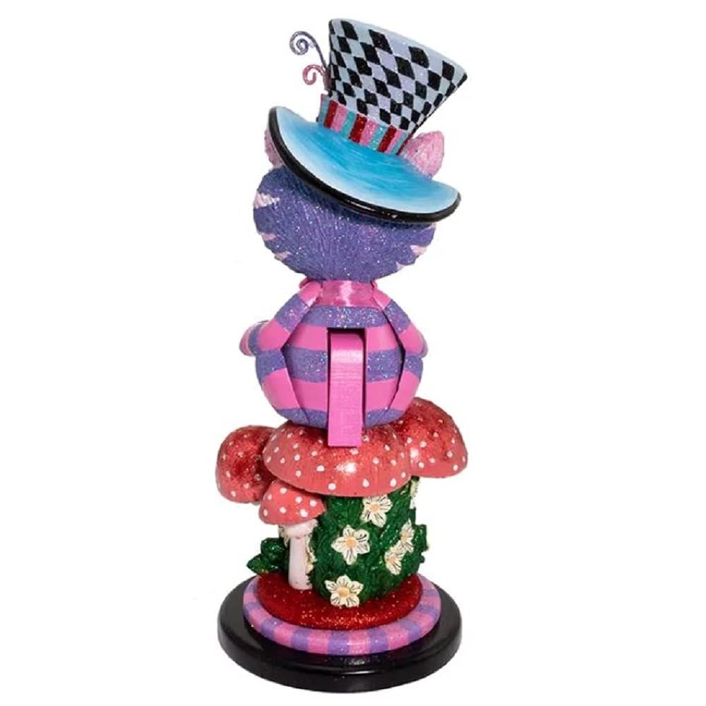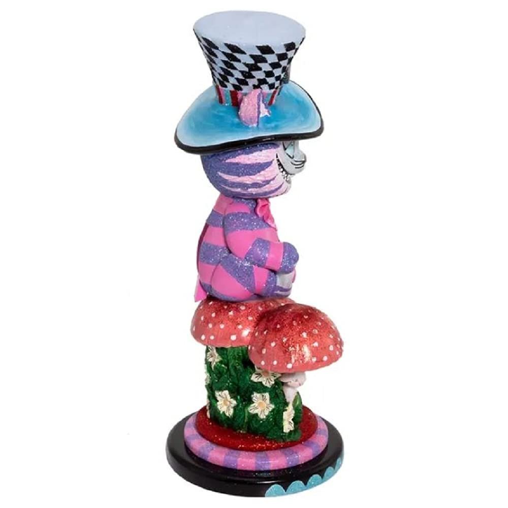 Hollywood™ Nutcrackers is a whimsical collection exclusively from Kurt S. Adler, Inc., featuring vibrant designs that twist traditional nutcrackers. This 15-inch Hollywood™ Cheshire Cat nutcracker sits atop a glittered mushroom forest base with a top hat and watch.