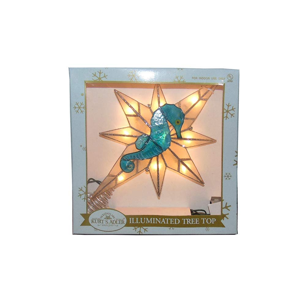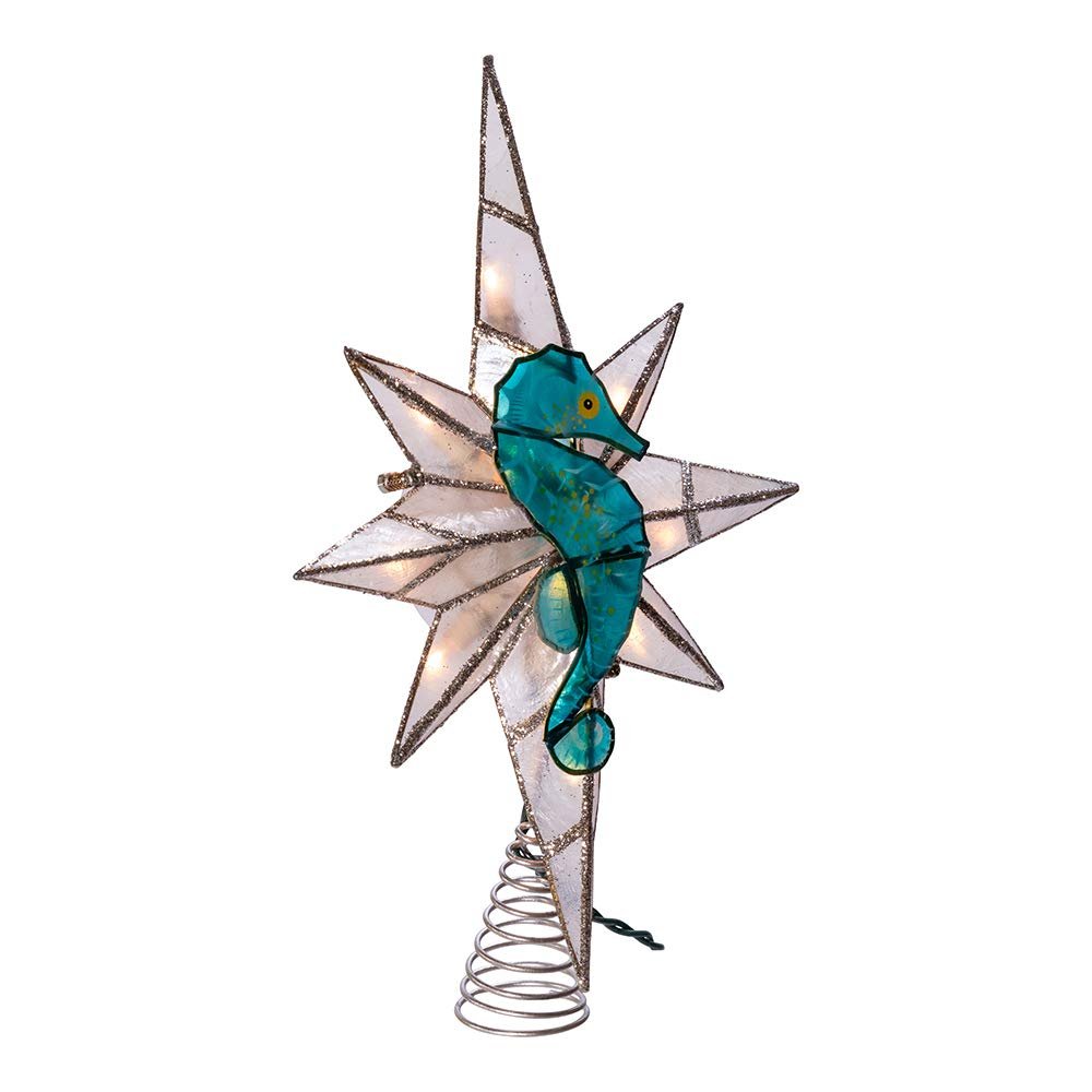This Kurt Adler Capiz Bethlehem Star With Seahorse Treetop enhances your tree lighting with a classic design and a stunning blue seahorse. The 8-point star features silver glitter details and is illuminated by 10 UL listed clear incandescent lights. Comes with spare bulbs and fuses for indoor use only. Item Size: 10 inches