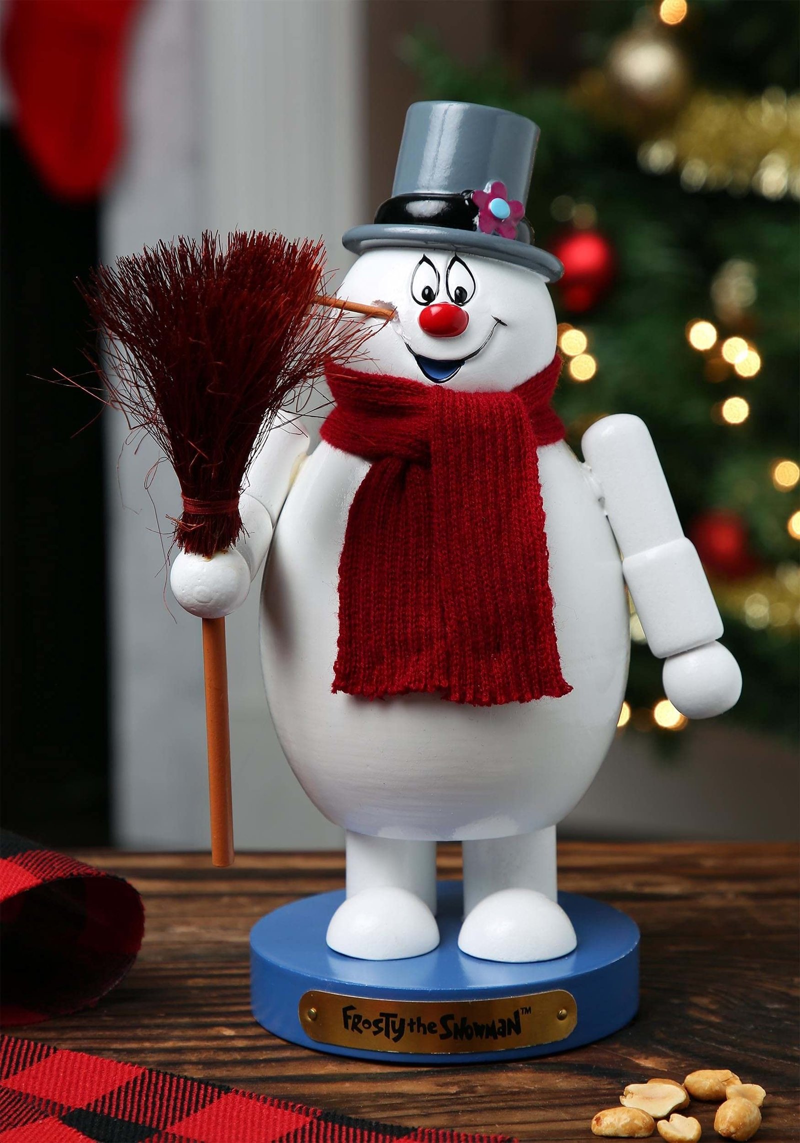 This 10-inch nutcracker is made of solid wood, resin, and other materials, featuring Frosty from the iconic TV special. Officially licensed and stands on a blue base reading “Frosty The Snowman.”