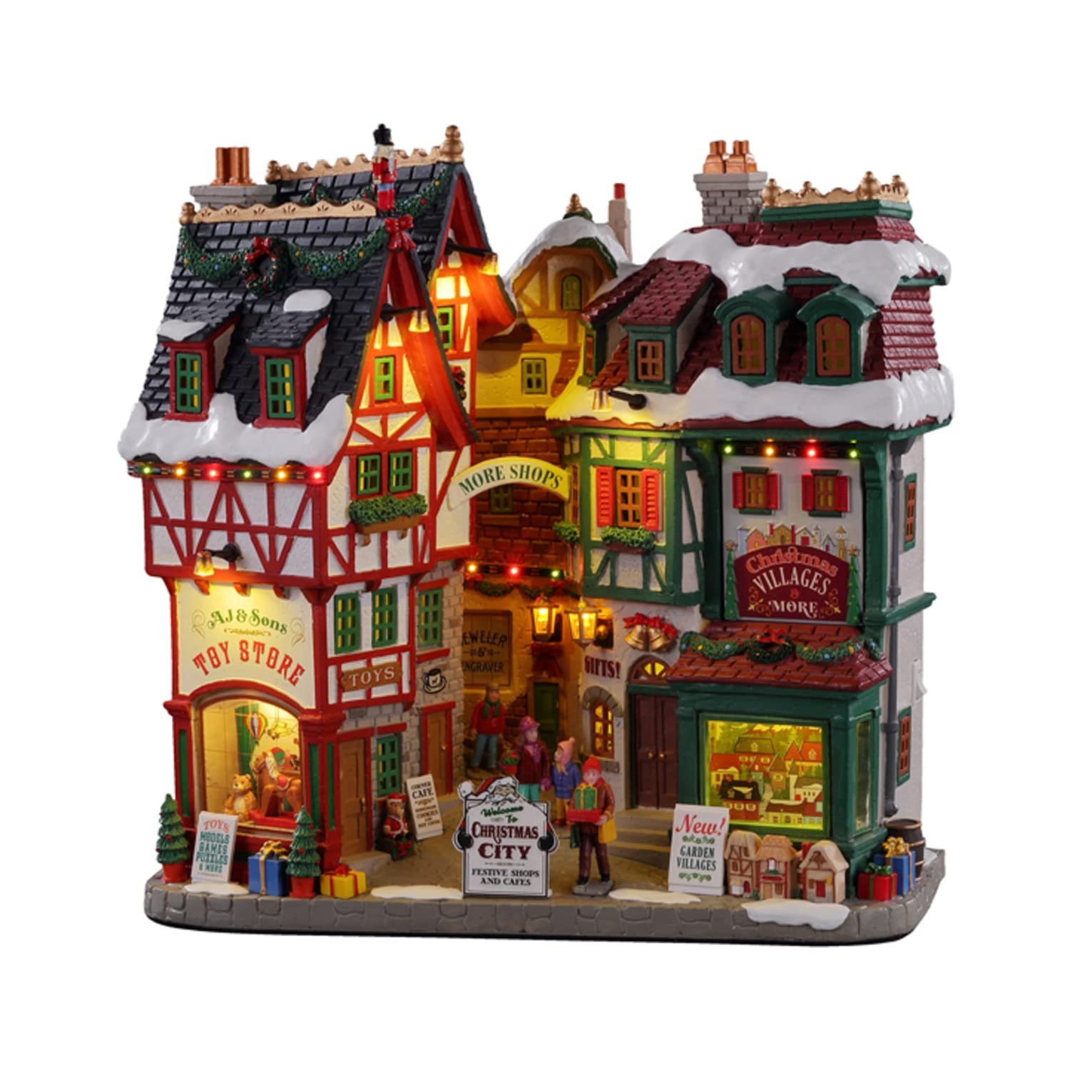 Lemax Collection Christmas City Lemax # 15739 features lights along the cornices. Approx. size: 10.83 x 10.63 x 4.53 inches (27.5 x 27 x 11.5 cm). Released in 2021. Made of Polyresin. Facades product type with On/Off switch. Requires AA size 1.5V batteries (not included). A/C adaptable with Lemax Power Adaptor, drawing approx. 135mA current at 4.5V DC.