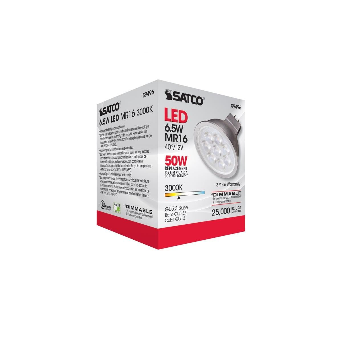 - LED Bulb Type: Satco’s MR16 LED bulbs with GU5.3 base provide energy-efficient lighting.