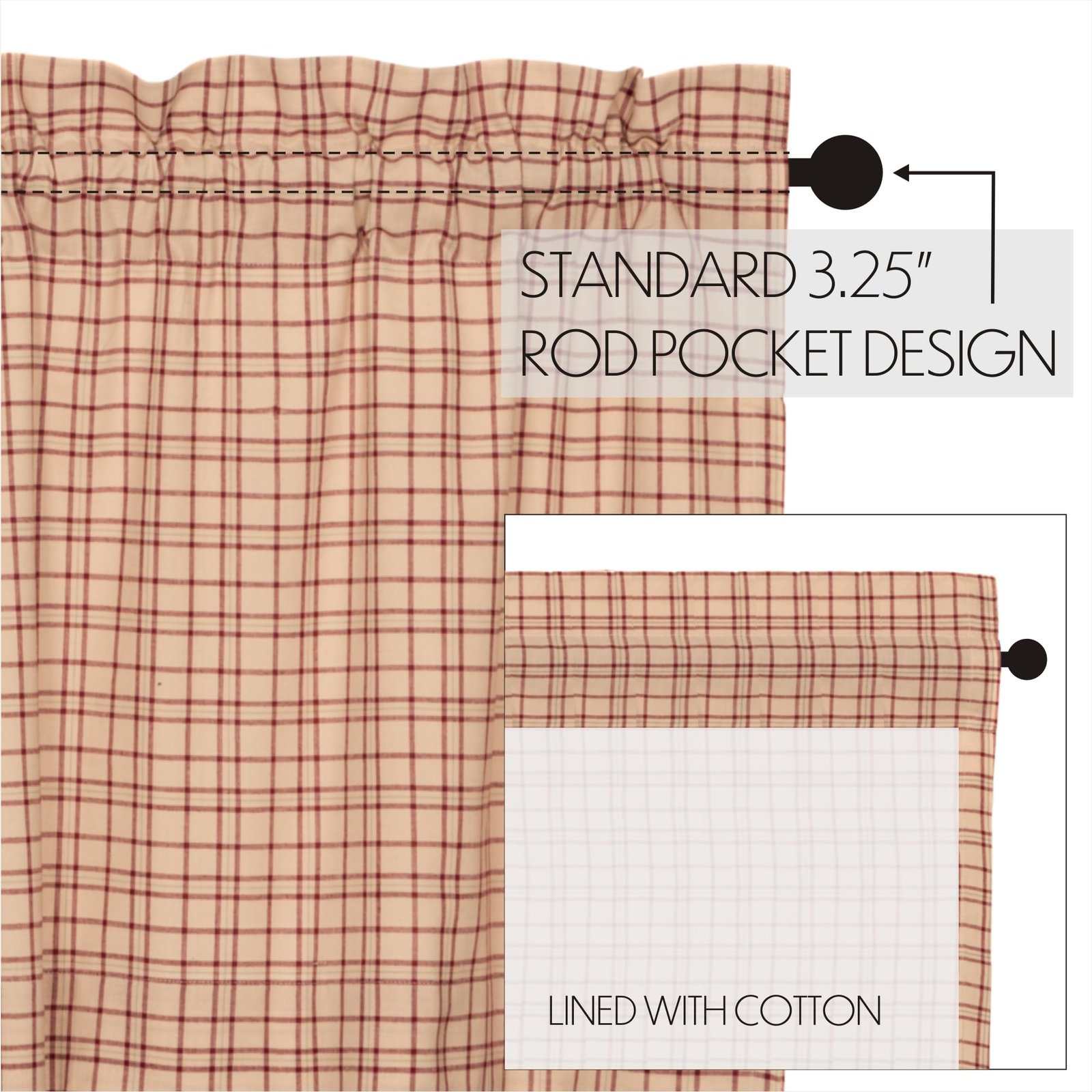 A 3.25 inch rod pocket fits any standard or decorative rod: panels include two button ties for pulling back the curtains. Lined The curtains filter sunlight with a back-lining and help regulate the temperature in any room all year. Natural, Breathable 100% Cotton This natural fiber is not only gentle on the skin but long-lasting. With easy care and time saved, you can focus more on what matters. Easy Care Simply toss our cotton curtains in your washing machine on a gentle cycle then promptly take them out and tumble dry low. Our curtains are safe to iron for your convenience after drying.